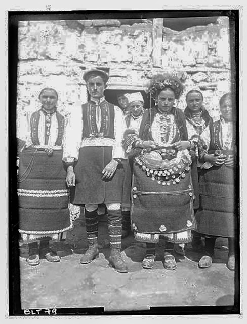 EN: Bride and groom in ceremonial costumes surrounded by girls in village Negochani